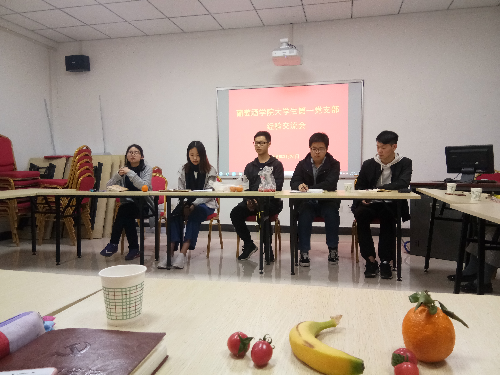621党团活动室举办经验交流会。支部邀请2014级成功考取浙江大学的贾若一同学及支部部分优秀大四学生党员代表为大家分享考研、保研、出国、工作经验。一支部全体党员参加,会议由党支部书记朱美蓉。