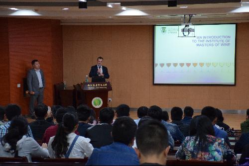 姚卓凡同学用流利的英语作开场白并对MW进行介绍,使同学们对全英文报告提前做好准备。Roderick Smith MW首先用汉语“你好”向大家送上诚挚的问候。随后他用英文对葡萄酒大师协会的悠久历史及发展现状进行了详实的报告。并对大家讲解WSET1-4级考试内容、学时等情况,在讲解过程中结合自身经历,用诙谐幽默的语言,向大家展示了一个普通青年到葡萄酒大师的奋斗过程。最后,他亲切的告诉同学们,全球共有365位MW,期待在座的同学们会成为其中的一员,报告会在热烈的掌声之中落下帷幕。