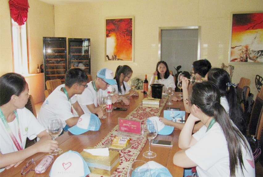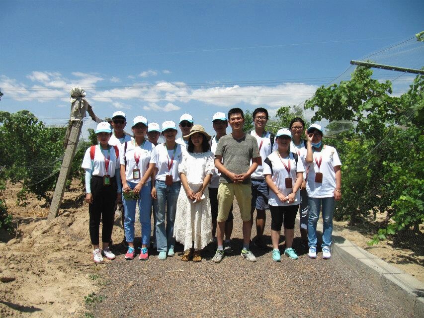 的98级吴鸿福师兄所在的办公室,吴师兄就酿造工艺,各类酒款、酿造理念及专业人才规模为大家作介绍。吴师兄强调,作为一名酿酒师,一定要用饱满的热情,用心去酿造每一瓶酒,做出自己的风格和特色。获得一手资料后,我们又在吴师姐的带领下参观了葡萄庄园的种植基地,对园内葡萄品种的生长特征及酿酒特性进行了初步了解,同时对所学知识有了新的体会。