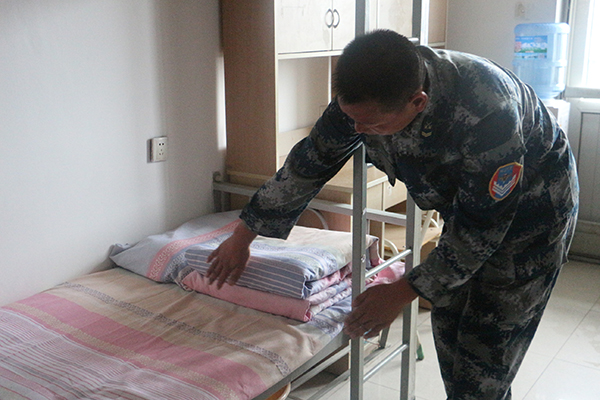 内务整理完毕后,小葡萄们整齐地、训练有素地依次站在各自寝室门口,怀揣着紧张而又激动的心情等待着教官的检查。尽管在检查过程中,教官毫不客气地指出内务的不足之处:军被摆放不够规范,毛巾没有叠成“豆腐块”状,桌面上的水渍没有擦干,地上隐藏的头发丝……但“铁汉柔情”却也名副其实,教官们在严格要求、苛刻检查的同时,也悉心教学、细心指导:为同学们重复示范被子、毛巾的叠法,亲自抚平床单上的褶皱,蹲下身来检查床下鞋子和脸盆……他们在检查内务过程中所流露出的专业、专注,无不让人受教于军人严谨认真的工作作风和人生态度。与此同时,小葡萄们也无不认真仔细地看着、听着、记录着,始终保持着谦逊、谨慎的态度。