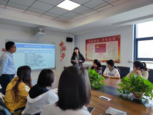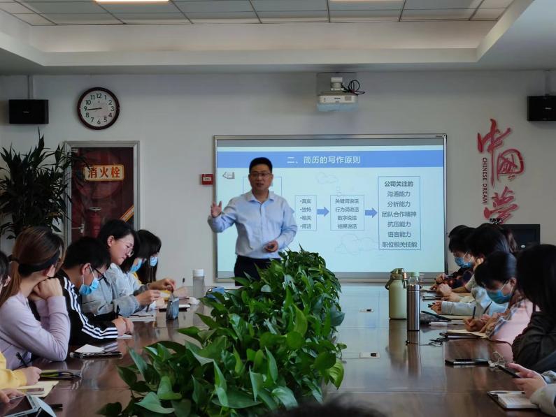 周海渊向同学们介绍了面试的基本知识、类型,并着重介绍无领导小组面试的要求和技巧。现场通过模拟无领导小组面试的过程,对同学们的表现进行总结,针对同学们在模拟过程中出现的不足提出了改进方案,在实践训练的过程中帮助学生了解无领导小组面试的加分项和扣分项。