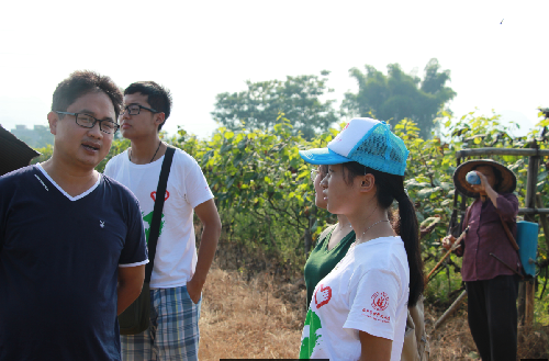 7月28日早上,西农赴广西葡萄酒酒庄调研队在热情好客的黄副总带领下前往参观当地的毛葡萄种植基地。种植毛葡萄也是当地居民的收入来源之一,所以沿途看到一片又一片葡萄园。来到种植基地后,发现基地位于山脚下,依山傍水,吸收天地之灵气,难怪用当地的毛葡萄酿出来的酒格外香醇清甜。
