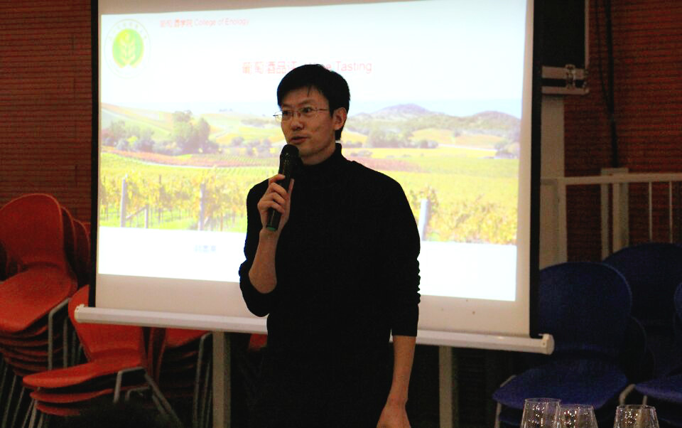 下午四时,品鉴会准时开始。协会团支书王志磊作为主持人致辞,简要介绍了葡萄酒爱好者协会的历史与荣誉,并宣布品鉴会正式开始。随后,韩富亮老师走上讲台,以“葡萄酒的魅力”为主题向与会成员传授葡萄酒相关知识。韩老师从诗词歌赋中的葡萄酒开始,为大家讲述中华历史长河中的葡萄酒渊源;又以一副世界地图为起点,向大家介绍了世界主要葡萄酒产区,葡萄酒国际形势,各国代表酒品以及我国葡萄酒的现状。韩老师提到,国外葡萄酒品牌对中国葡萄酒市场有着强烈的冲击,国人普遍对国外葡萄酒品牌的接受程度高于国内。这是由于中国有自己的酿造技术,却没有可以区别于国外葡萄酒的特点以及突出的优点,值得注意的是,中国早在商周时期就已出现葡萄酒,这样的局面令人深思。