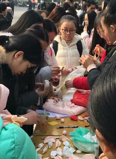 的社践部同学们在西雕吆喝着:“冬至这天包水饺啦”。路过西雕的同学们看到桌子上摆满了水饺,看着这橡皮泥做的面皮和行云流水般的擀“面”手艺还真给人一种冬至佳节到,饺子都说好的感觉。饺子形态各异,不由得令人驻足;玲珑小巧,不禁让人跃跃欲试。参与包饺子的朋友们越来越多,愈发显得节日的热闹,饺子皮拿在手上被同学们赋予了无限的可能性。可以不同颜色,可以不同造型,可以不同馅料。南方人包的饺子小巧而精致,北方人包的水饺豪气而又实诚。