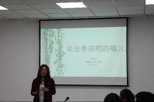 毛培文学姐分别从自我追求,学习科研,学生工作与社会实践,思想与世界观五个方面进行主讲。她通过举自己切身的事例让同学们更加直观的对学习生活,科创等方面有进一步的认识。并且她希望大家可以以宽容理性的心态去对待学生工作,把学生工作当作自己生活的一种调节品。要有自己独特的思维方式,才能做最真实的自己。