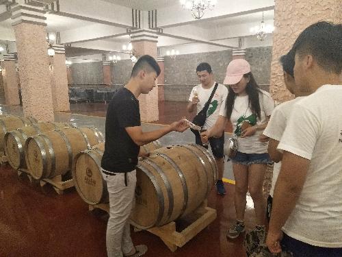 到达酒庄附近后,因酒庄面积较大,队员们无法到达酒庄生产基地,酒庄负责人热情地前来接了队员们,到达生产基地之后,在酒庄负责人的带领下,队员们首先参观了酒庄的酒品展示区,并品尝了几款酒庄特色葡萄酒,了解了酒庄的建立背景,据负责人介绍,红桥酒庄在生产销售葡萄酒的同时还发展旅游业,在酒庄广阔的地域内,酒庄还建了一片人工湖,蒙古包、农家乐及度假酒店,酒庄经营项目虽多,但红桥酒庄葡萄酒的品质和销量是非常可观的,该酒庄种植的大片有机葡萄田是酒庄最亮丽的一道风景,再加上酒庄靠近闻名世界的丹霞地貌,这就创造了酒庄发展旅游业得天独厚的条件,因此葡萄酒产业给酒庄带来了更广阔的发展前景。同时旅游业的发展也是为葡萄酒做宣传,带动了葡萄酒的销量。负责人介绍,该酒庄葡萄酒要销往全国各地,但是由于南北方的饮食文化的差异,葡萄酒在南方的市场是比较大的。
