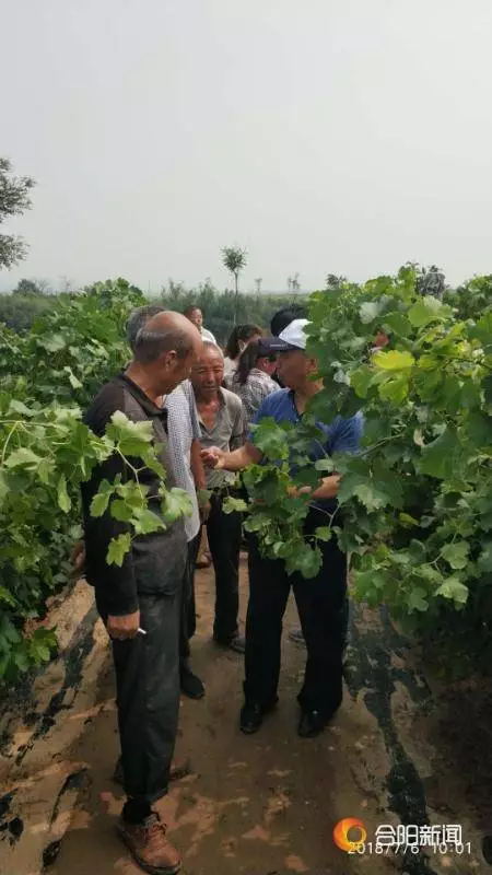 7月5日,天刚一放晴张宗勤教授就及时赶到合阳葡萄试验示范站做好下地准备,7月6日,经过一天太阳暴晒的地面已经能承受脚底板的压力,一大早张宗勤教授就赶到丰阜园区查看病害指导防治;接着又马不停蹄的赶到乾落村扶贫产业园,分别查看老园子、挂果幼树、新栽幼树的病害情况,在经过一翻仔细查看,与果农讨论交流后,张宗勤教授给出了病害防治的紧急措施: