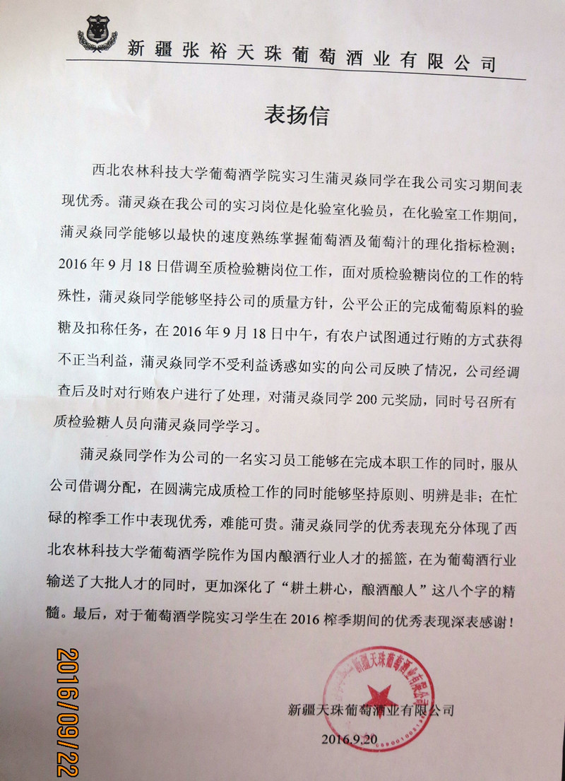 近日,在欧美激情 本科生校外葡萄酒工厂实习过程中,葡萄与葡萄酒工程专业2013级1班学生蒲灵焱同学受到新疆天珠葡萄酒业有限公司表扬奖励。 蒲灵焱同学在校外顶岗实习期间,面对质检验糖岗位的工作特殊性,能够坚持公司的质量方针,公平公正完成葡萄原料的验糖及扣称任务。在有农户试图获得不正当利益时,该同学能够坚持立场,及时向公司反映情况,公司特对该同学提出表扬并给予200元奖励,同时号召所有质检验糖人员向蒲灵焱同学学习。