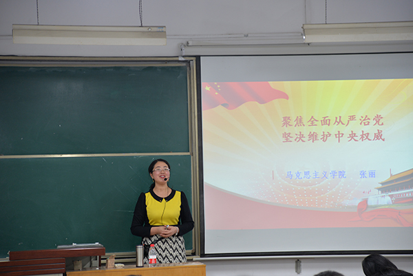 张老师从十八届六中全会举办的时间、参会人员、会议议程等方面向同学们介绍十八届六中全会的基本情况,并详细地为大家介绍了十八届六中全会的重要意义:是贯彻四个全面战略布局的需要,是实现两个百年和民族复兴的需要,是深化从严治党的需要。张老师提到了十八届六中全会的第二个主要内容:确立核心维护权威,即确立了以习近平同志为核心的党中央权威。全会提出,坚决维护党中央权威,保证全党令行禁止,是党和国家前途命运所在,是全国各族人民根本利益所在。张老师又为大家介绍了《关于新形势下党内政治生活的若干准则》的主要内容:加强和规范党内政治生活的总的方针要求;规范党内政治生活具体要求,并讲授了《中国共产党党内监督条例》的主要内容,确保党章党规党纪在全党有效执行,维护党的团结统一的任务以及保证党的组织充分履行职能,发挥核心作用的目标。其间,张老师特别强调,《条例》和《准则》应该以高级干部为重点对象。
