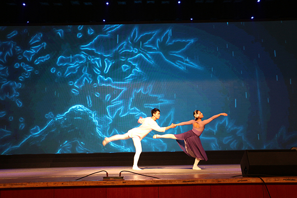 14级郑艺丹同学和15级李享远同学倾情演绎,将初遇时彼此心花无涯的惊艳、热恋时恋人间缠绵悱恻的情感以及不得不分离时花开两朵、天各一方的无奈描绘得淋漓尽致。“向天歌”即一群美丽的小天鹅,或踮起脚尖,游曳在静谧的湖面;或舒展腰肢,起舞于流光的音乐。舞者曼妙的舞姿、默契的配合所塑造出来的精美的舞台效果,是对大自然最好的赞颂。