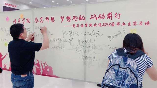 、感念师恩、梦想起航、砥砺前行”为主题的欢送毕业生签名墙,同学们的感恩之情和老师们的美好祝愿,都化作了签名墙上动情的话语。“甲贵爸爸”、“和财爷爷”、“继红妈咪”这样的昵称,体现了学生对老师的认可和爱戴,“感谢全院老师的栽培,么么哒!”、“牢记教诲,老师保重!”、“出航四海,欧美激情