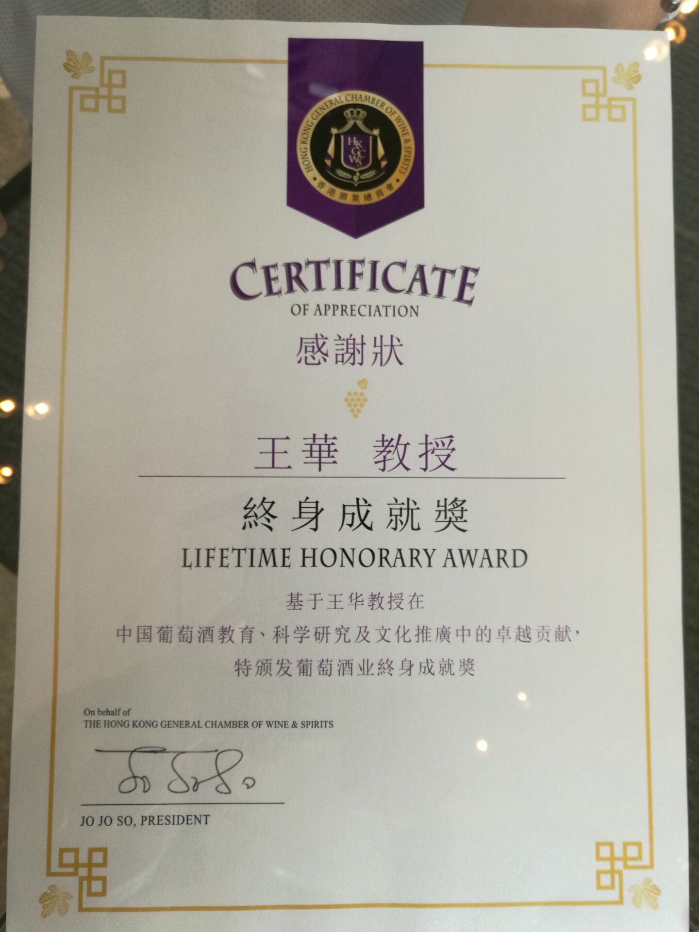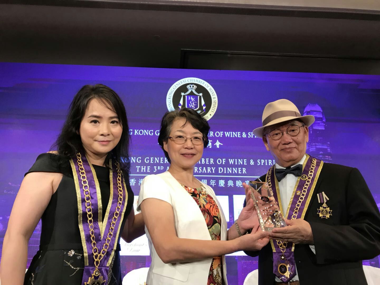 中国葡萄酒博物馆馆长王华女士荣获香港酒业总商会“终身成就奖”,苏又萍会长和邱则喤主席为王华教授颁奖。
