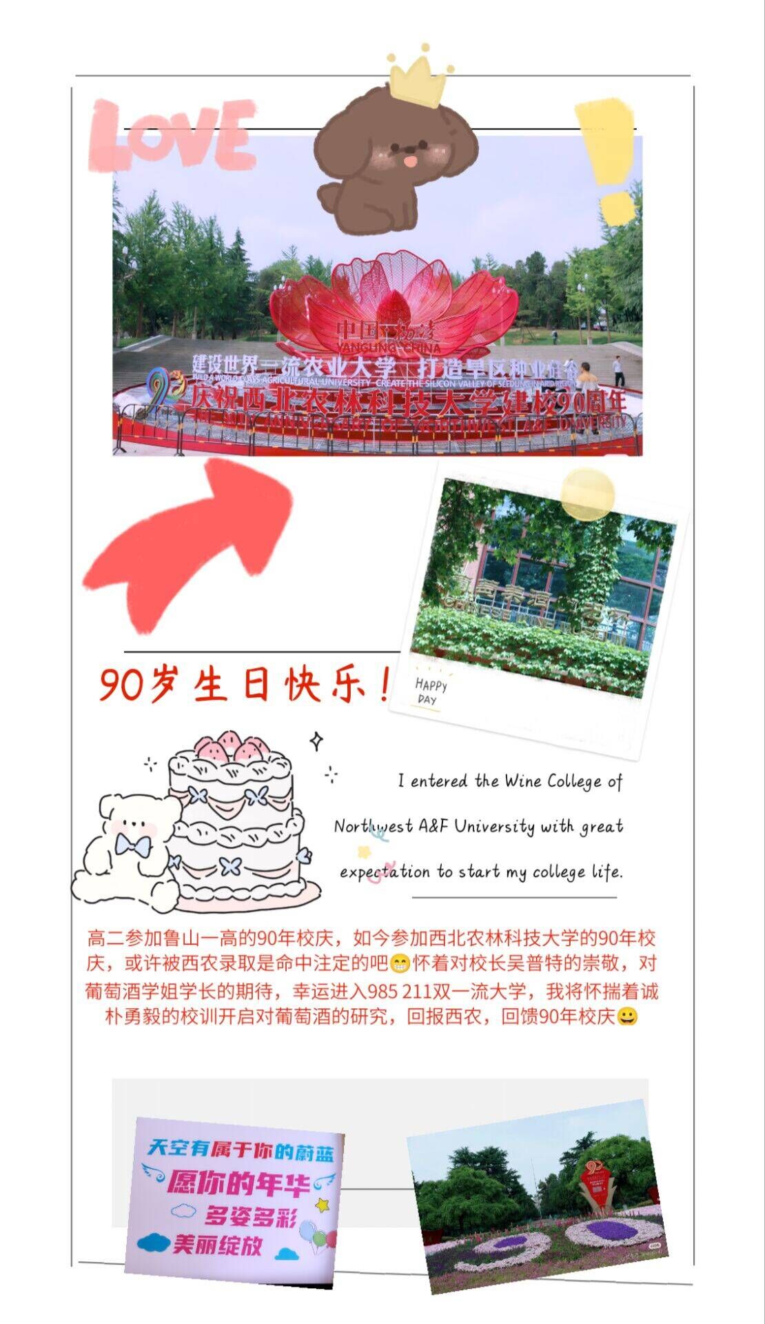 前置教育,由“新”而生。在西农90周年校庆这一具有纪念意义的节点,为2024级小葡萄们精心策划了一系列入学作业,涵盖感恩教育、校庆祝福、生涯规划三大板块。号召新生为家人“烹饪一顿美食,品味一杯葡萄酒”,教育和引导新生常怀感恩之心;引导同学们了解西农、认识西农,为西农九十周年校庆献上祝福,培养爱校荣校、知农爱农情怀;倡导同学们谱写大学成长蓝图,初步培养生涯规划意识。
